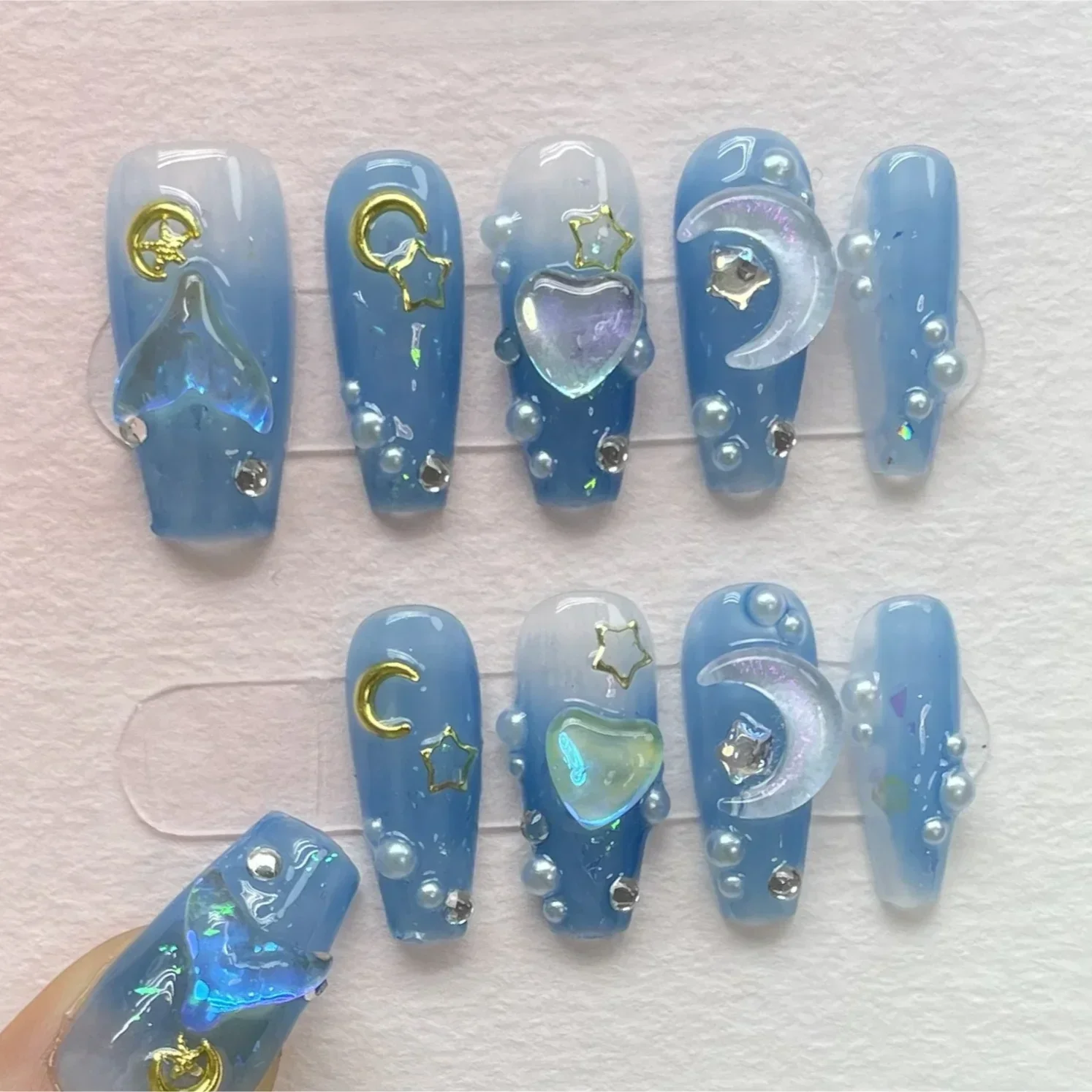 10 Uds. De uñas artificiales francesas cortas hechas a mano, ojos de gato, diamantes de imitación brillantes, cubierta completa, uñas postizas de ballet con pegamento