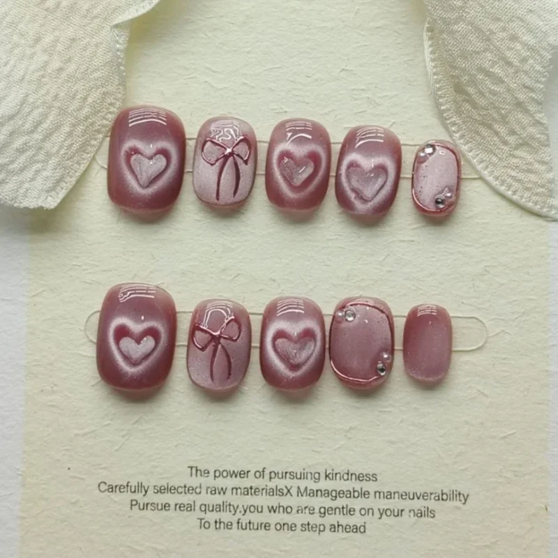 10 Uds. De uñas rosas hechas a mano con purpurina, ojo de gato con diseño de corazón, cobertura completa corta, puntas de uñas postizas acrílicas para mujeres y niñas