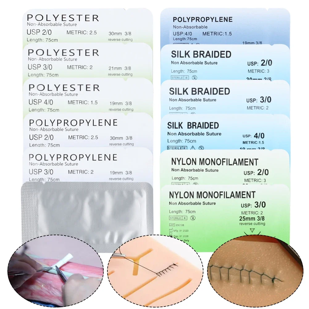 2/0 3/0 4/0 sutura de simulación quirúrgica nailon seda polipropileno poliéster cirujano puntada de aguja para la educación de estudiantes de medicina