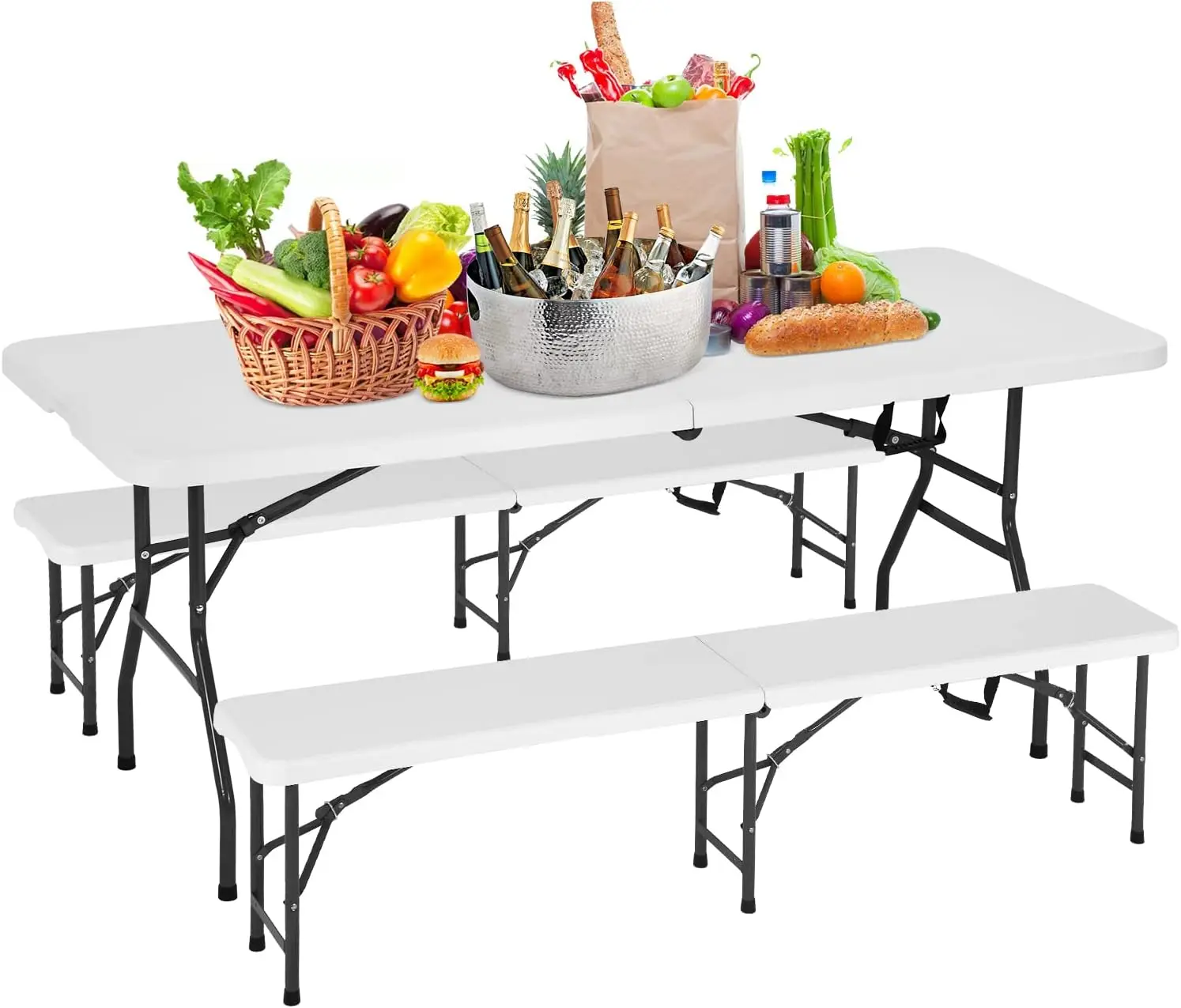 3-Piece Picnic Table Bench Set 6FT Camping Folding Plastic with Two Benches Carrying Handles