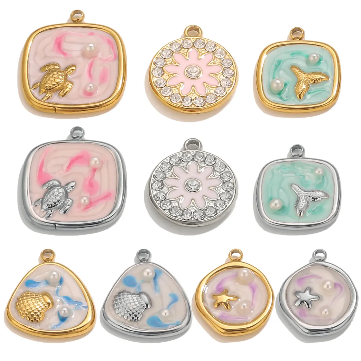 5 uds. De colgantes bonitos de elementos marinos con forma de gota de aceite esmaltada y de acero inoxidable, pulsera de collar DIY de oro de 18 quilates para mujer, joya al por mayor