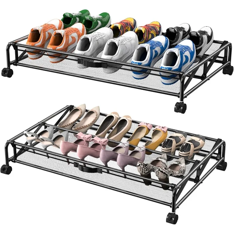 Almacenamiento de zapatos debajo de la cama con ruedas, paquete de 2 contenedores de almacenamiento rodantes debajo de la cama para zapatos, Zapatero de Metal, organizador para dormitorio
