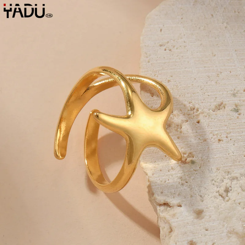 Anillo abierto Simple de acero de titanio para mujer, estrella de mar ajustable, Color dorado, fiesta de graduación, 1 pieza