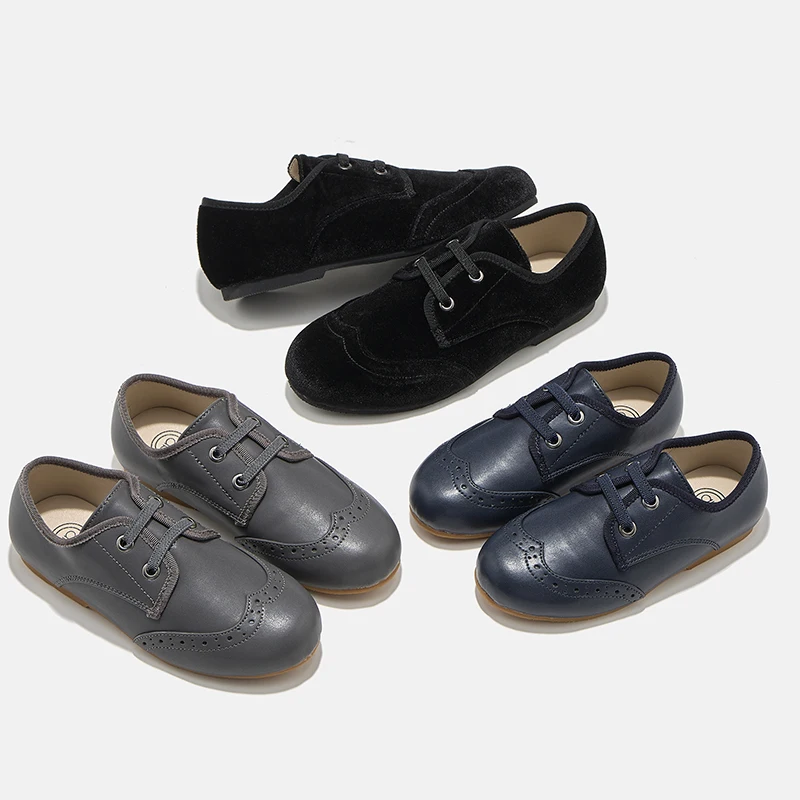 AP8-003 Zapatos de vestir para niños Cuero gris Terciopelo negro Cordones decorativos Zapatos de diseño clásico Nuevo invierno
