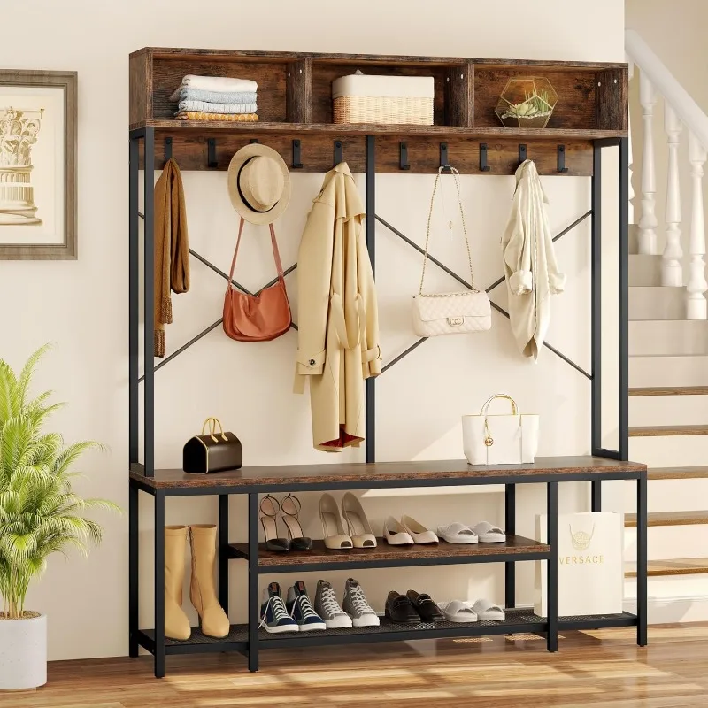 Banco de entrada con percha, árbol de recibidor 5 en 1 con zapatero, 10 ganchos para pasillo, dormitorio, marrón rústico