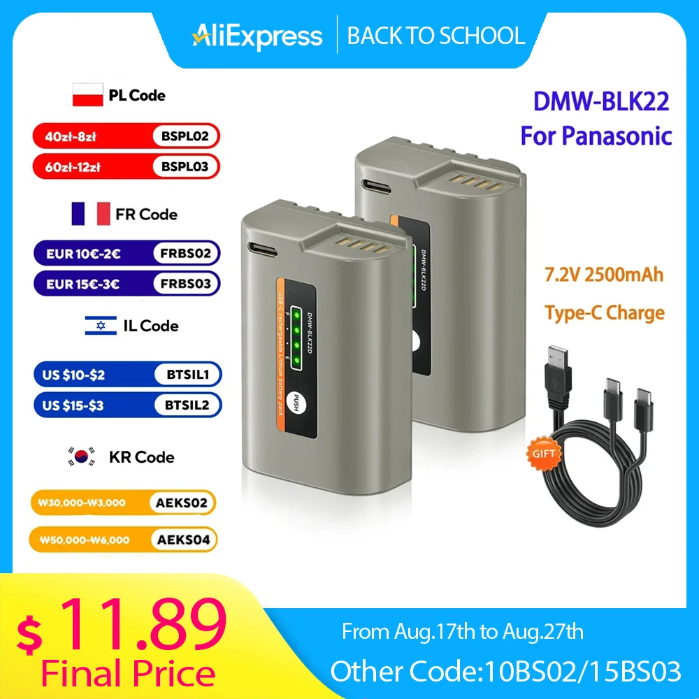 Batería de 2500mAh DMW BLK22 DMW-BLK22 + Cable de carga rápida tipo C para Panasonic LUMIX S5 S5 II S5 IIX DC-S5 DC-S5 II Lumix GH5 GH6