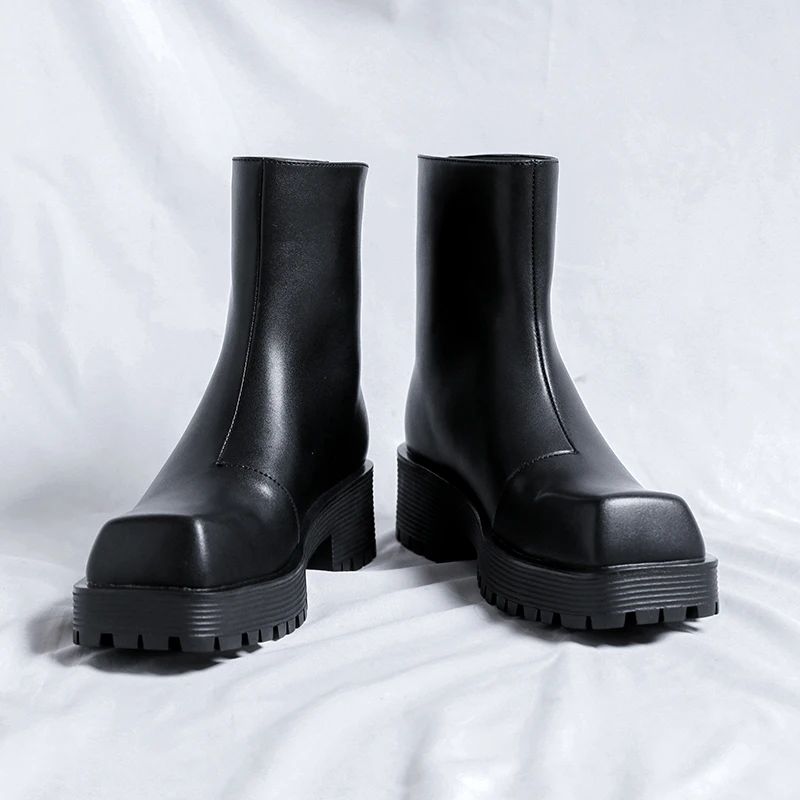 Botas de chimenea europeas y americanas con cabeza cuadrada y tacón inclinado para hombre, botas altas de moda para exteriores con aumento de altura
