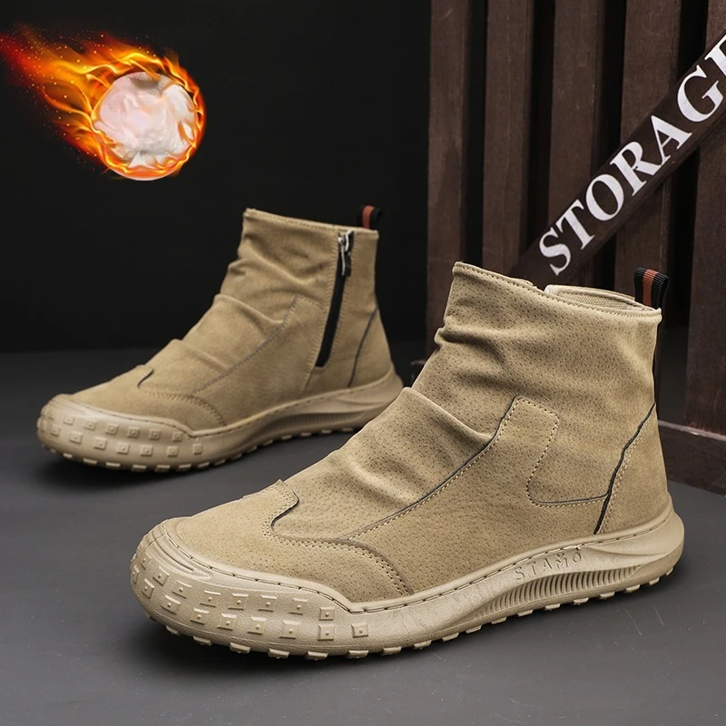Botas de nieve para hombre, zapatos altos de invierno, otoño, nueva cremallera plisada, antideslizante, cómoda, suela gruesa, botas planas de moda resistentes al desgaste