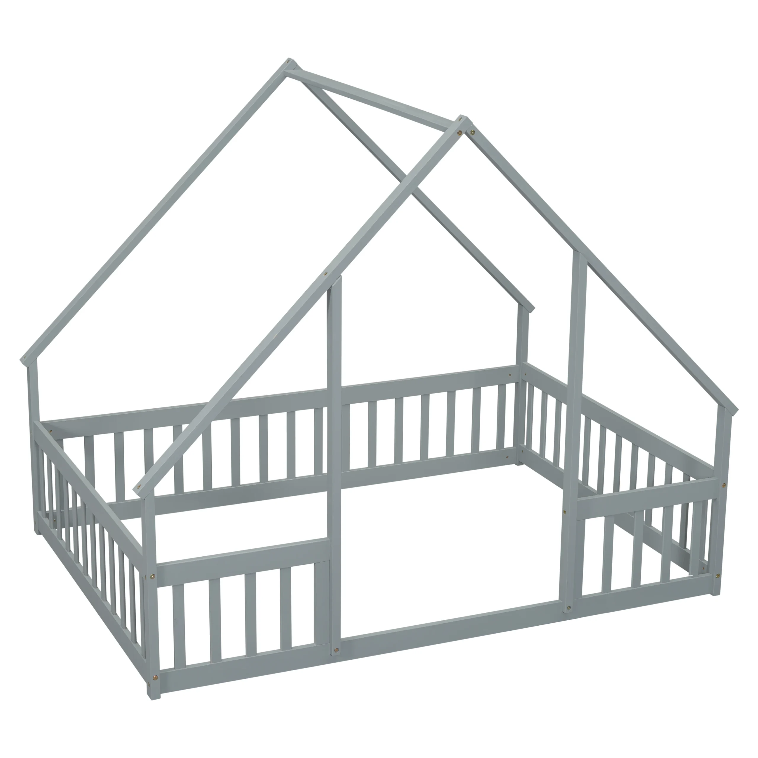 Cama de piso en forma de casa de madera completa con valla, barandillas