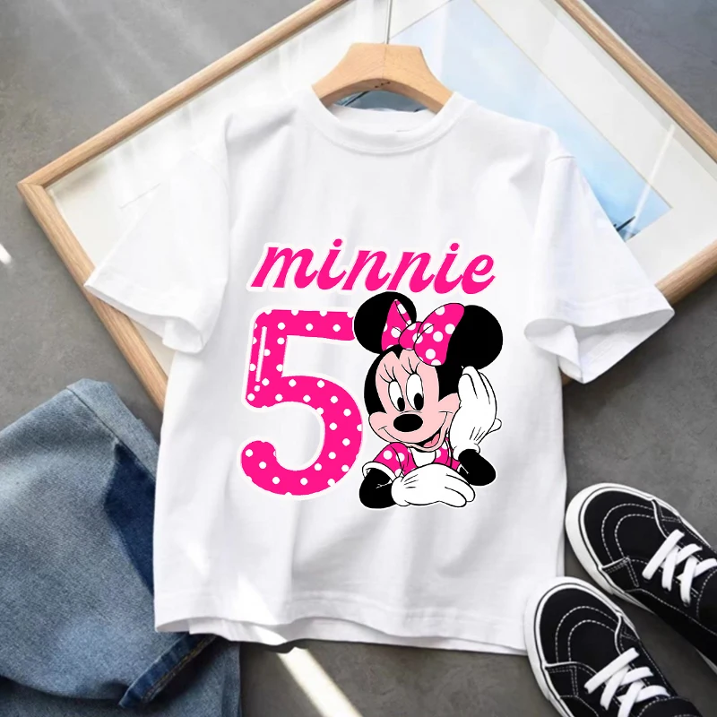 Camiseta de cumpleaños de Minnie Mouse para niña, camiseta con números de dibujos animados bonitos, camisetas estampadas de manga corta para niños, ropa informal de verano para bebé, regalo