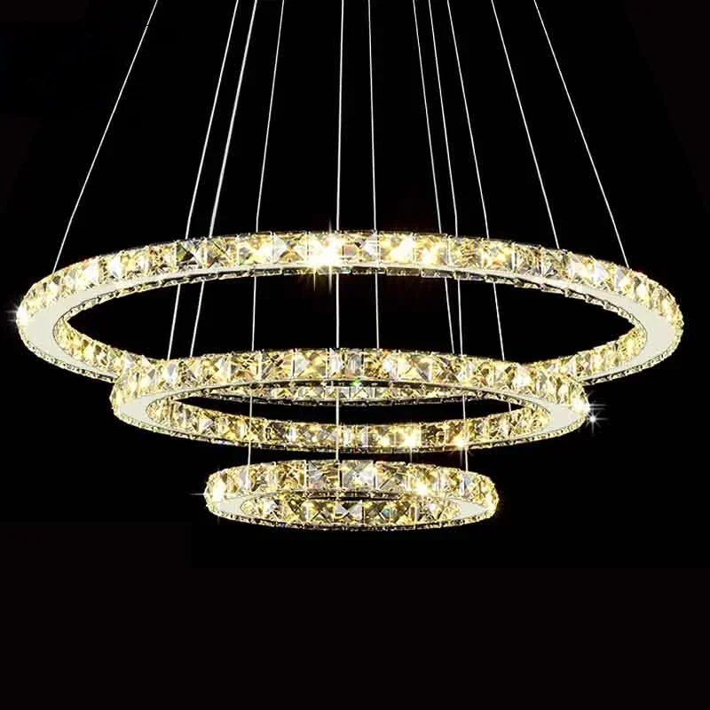 Candelabros modernos con anillo de diamante LED, acabado de espejo cromado, lámpara colgante de acero inoxidable para habitación, Lustres