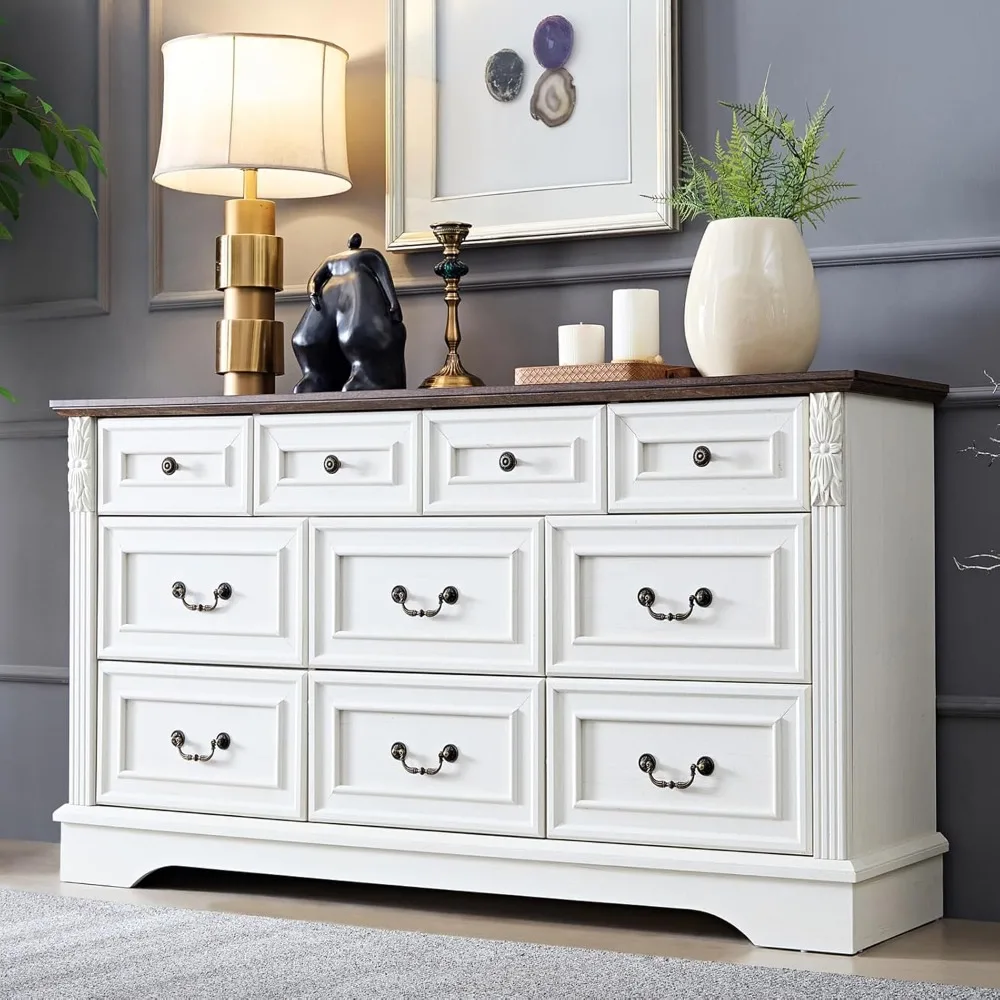 Cómoda de granja para dormitorio, 10 cajones, organizador de gabinete blanco antiguo con diseño tallado para sala de estar