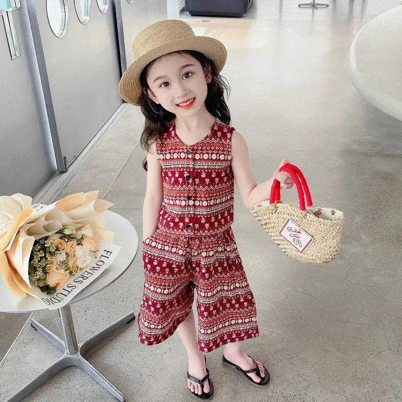 Conjunto de verano para niña, nuevo vestido de verano de estilo étnico dulce, chaleco de moda para niños, pantalones de pierna ancha de dos piezas, 2025