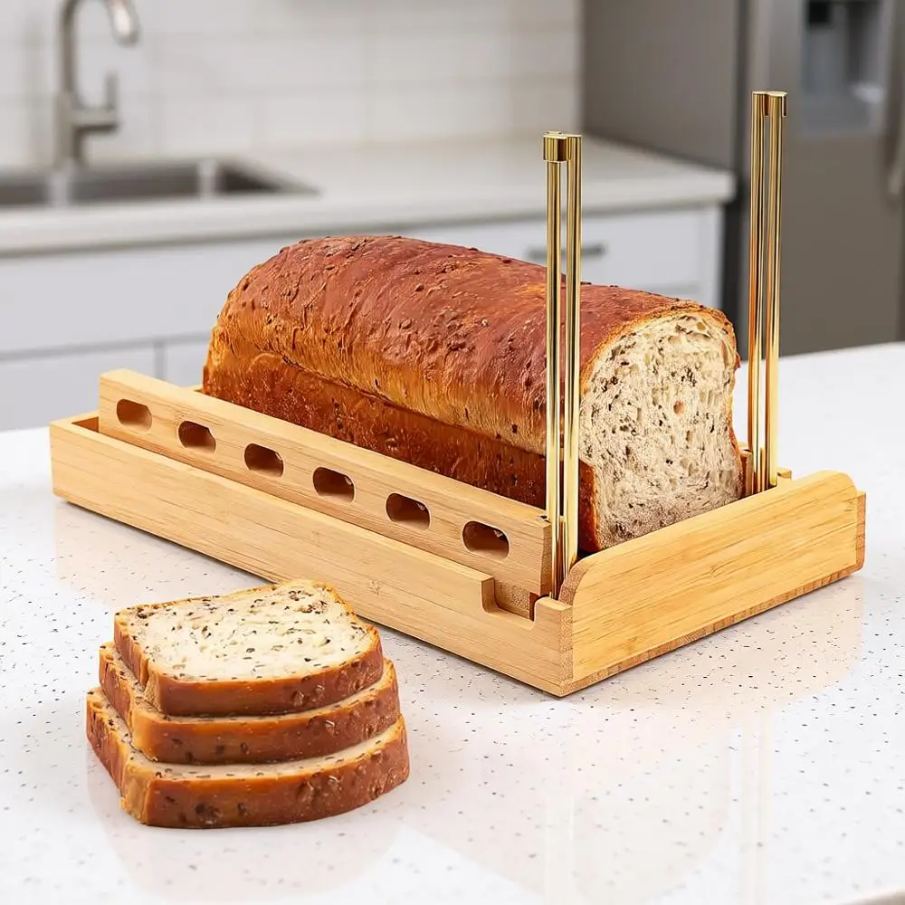 Cortador de pan de bambú o pan casero – Guía ajustable de 6.5 pulgadas de ancho para cortar rebanadas uniformes, 4 opciones de grosor – Funciona con [dispositivos/funciones]