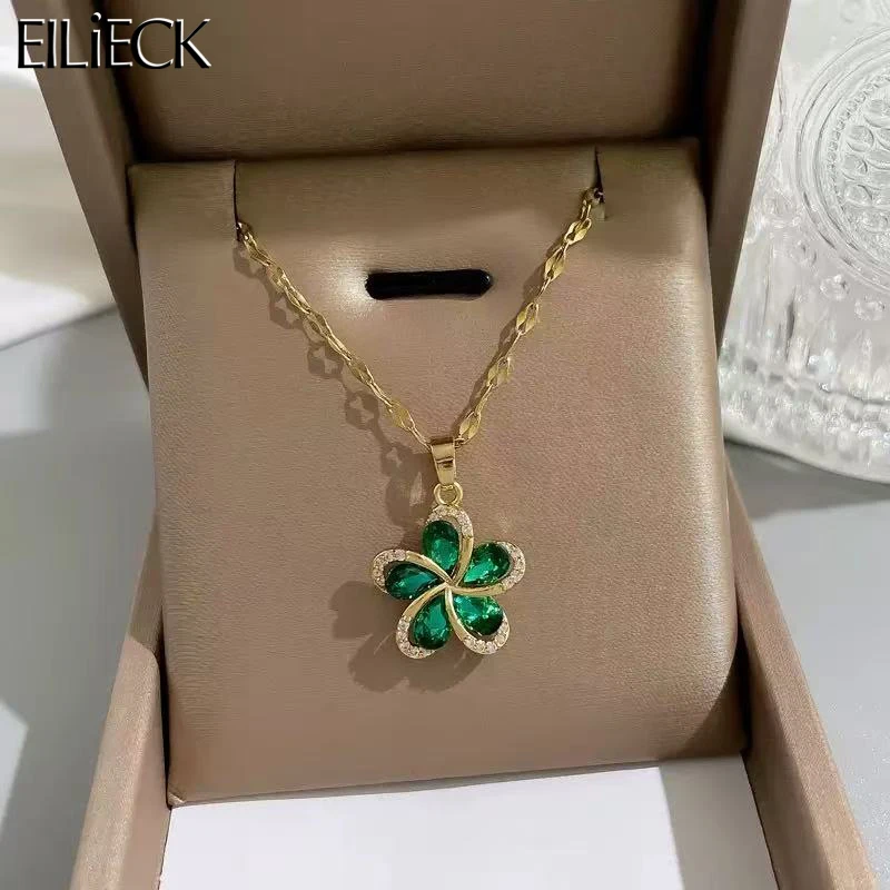 EILIECK-collar con colgante de flor de circón cúbico verde para mujer, de acero inoxidable 316L, cadena para el cuello con temperamento de lujo, joyería de moda