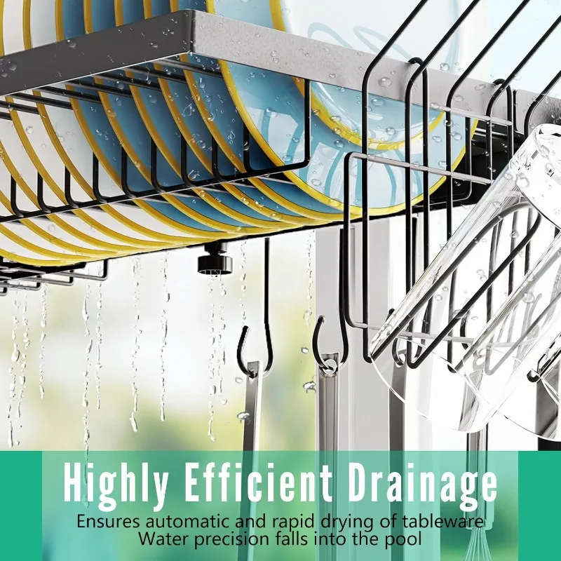 Estante para secar platos sobre el fregadero, estante para platos grande ajustable (largo y altura), escurridor de platos de acero inoxidable de 2 niveles y 4 cestas