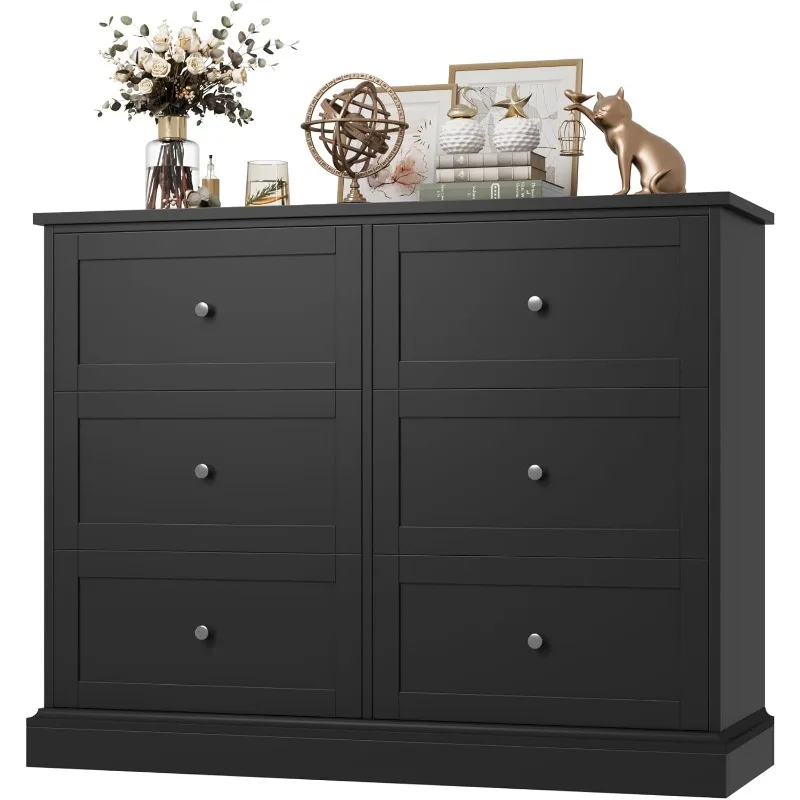 FOTOSOK Cómoda negra, cómoda de 6 cajones negra, cómoda doble moderna con cajones profundos, gabinete organizador de almacenamiento amplio para sala de estar