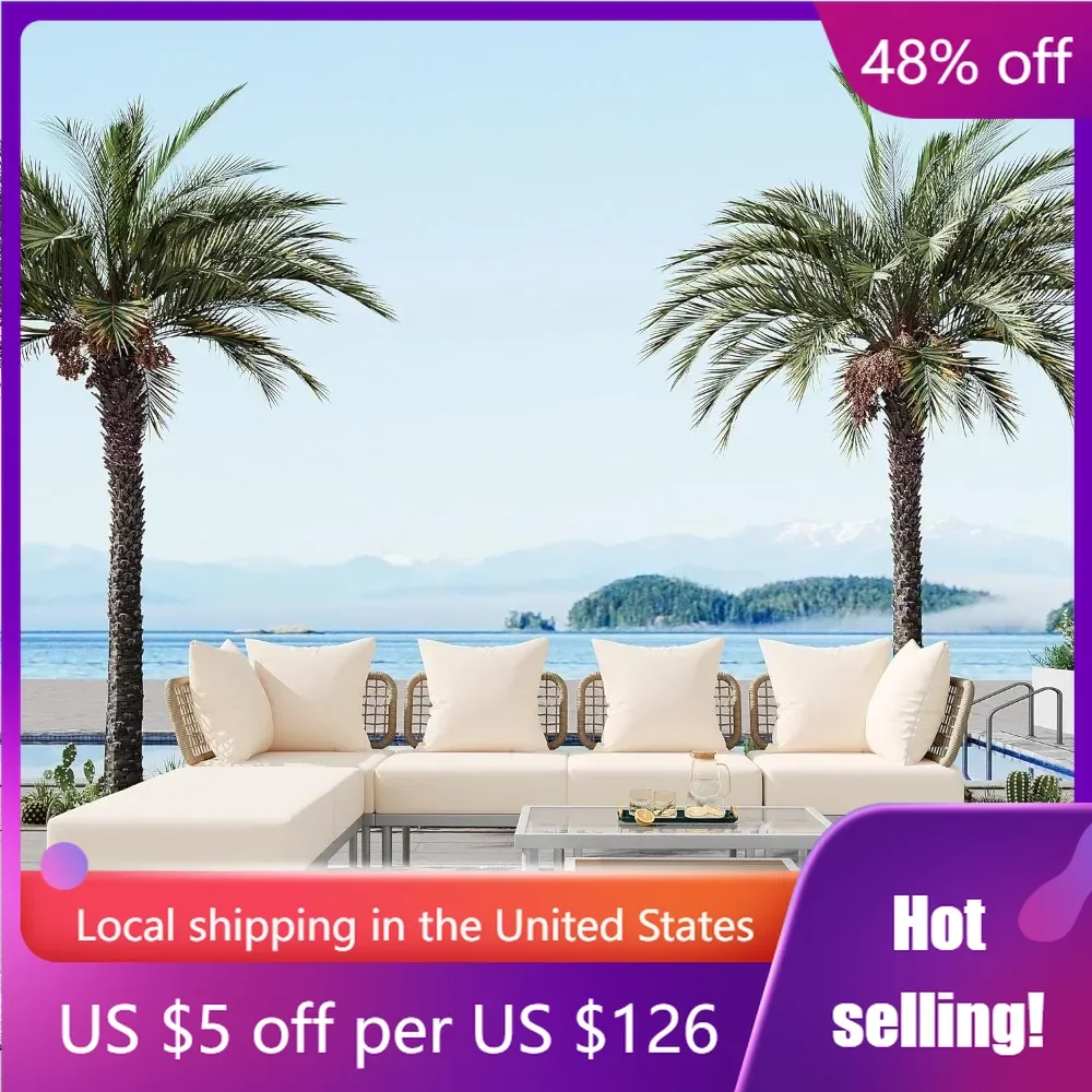 Juego de sofás seccionales para Patio con 2 sillones de esquina, dos mesas, seis almohadas, muebles de exterior en forma de L para jardín, 8 piezas