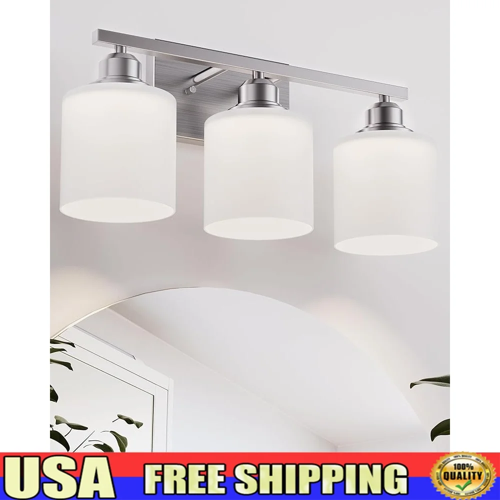 Lámparas de tocador de baño de 3 luces sobre espejo, níquel cepillado antioxidante con pantallas de vidrio, enchufe E26, fácil instalación