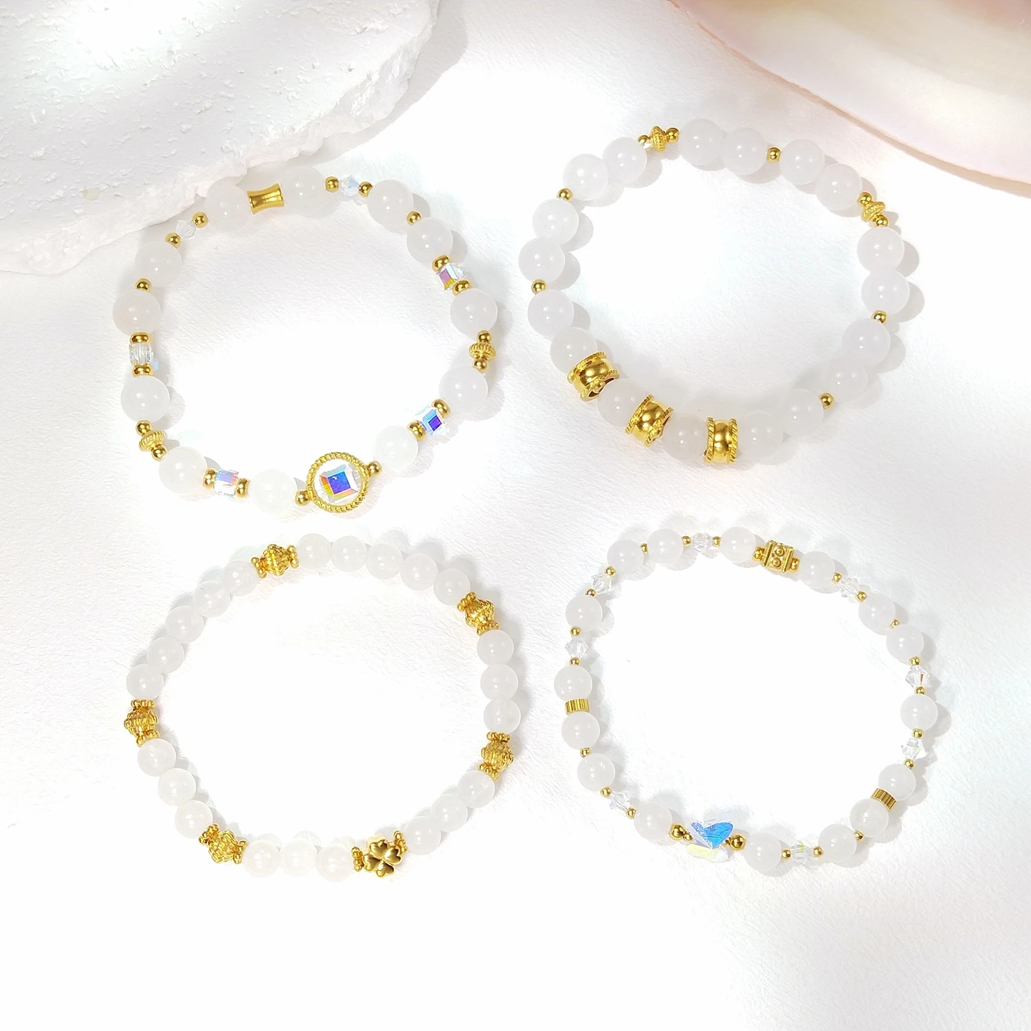 Lii Ji Pulsera elástica de acero inoxidable dorado de 6/8 mm de jade blanco natural