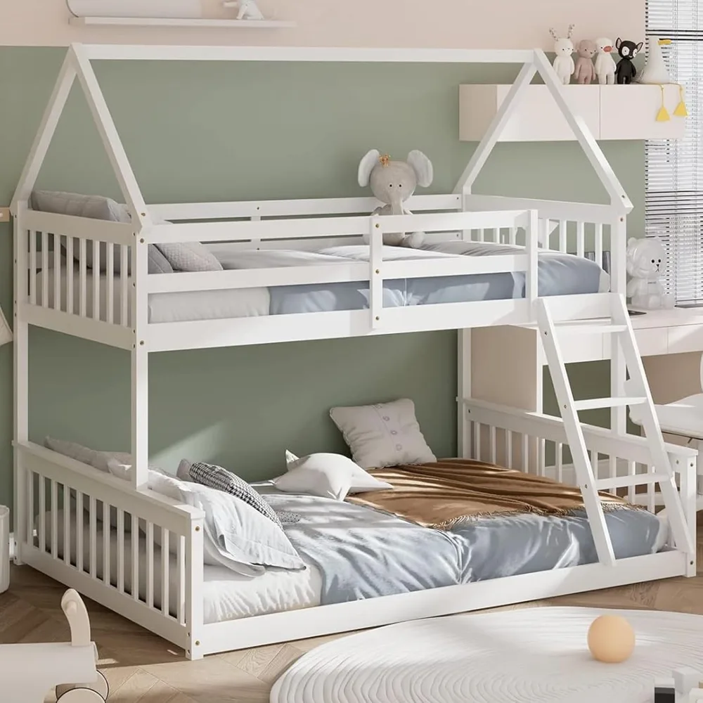 Litera, escalera empotrada, convertible a 2 camas, camas de suelo para niños, adolescentes y jóvenes, marco de cama de casa de madera maciza
