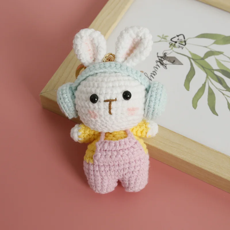 Llavero de conejo de ganchillo hecho a mano, conejo de dibujos animados con auriculares, muñecos de animales bonitos, llaveros tejidos para bolso, accesorios colgantes