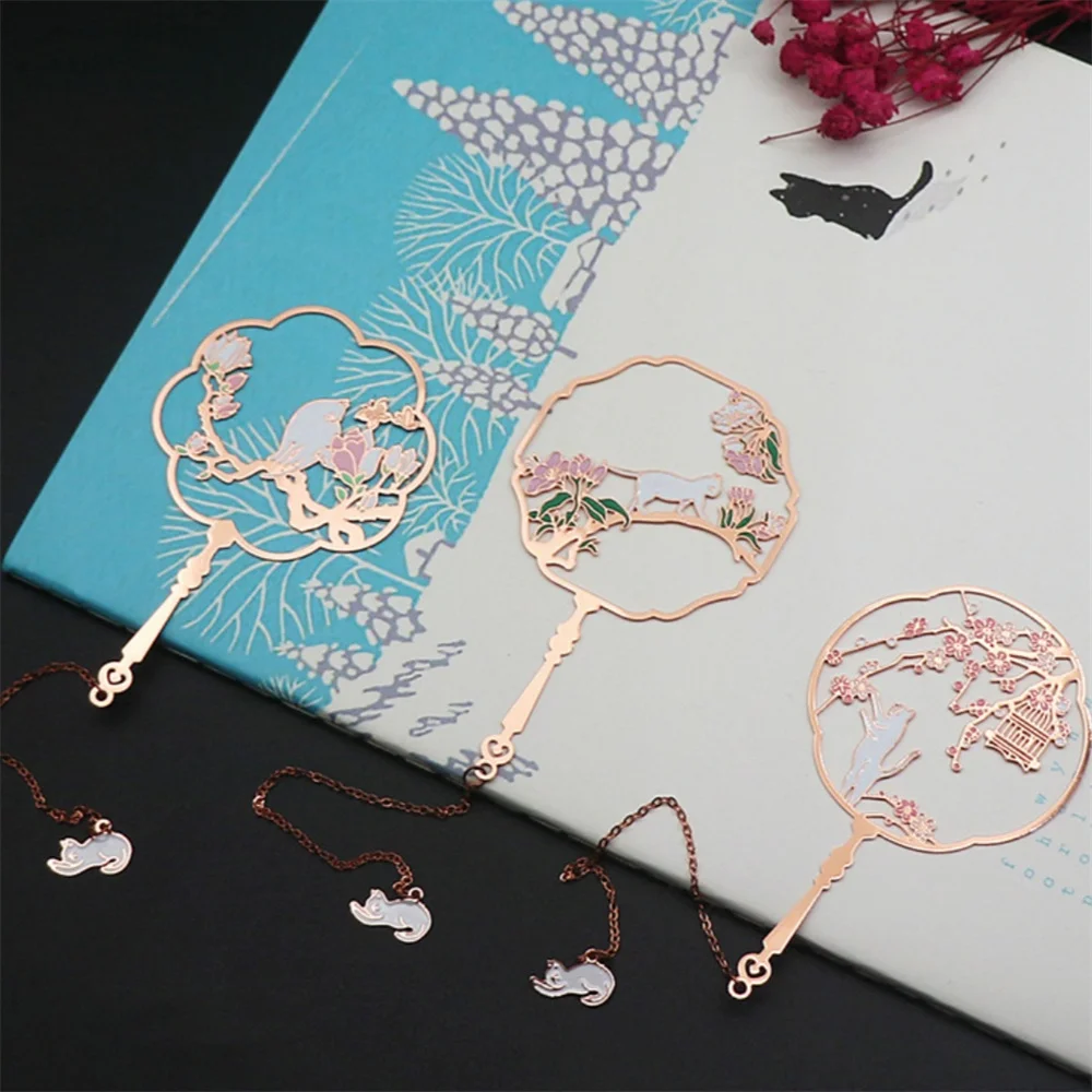 Marcador de libros hecho a mano de estilo chino, marcapáginas de gato con flor rosa dorada, marcador de lectura para amantes de los libros, regalos para colección de amigos