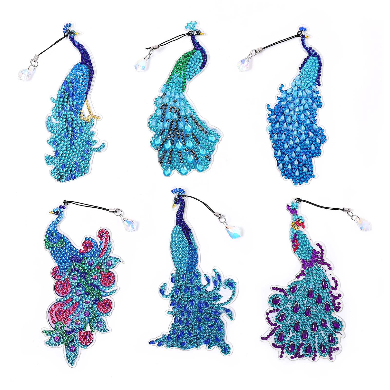 Marcapáginas de bordado de diamantes 5D para niños, manualidades DIY, patrón de pavo real, acrílico más grueso, cristal de un solo lado, pintura de diamantes, 6 piezas por juego