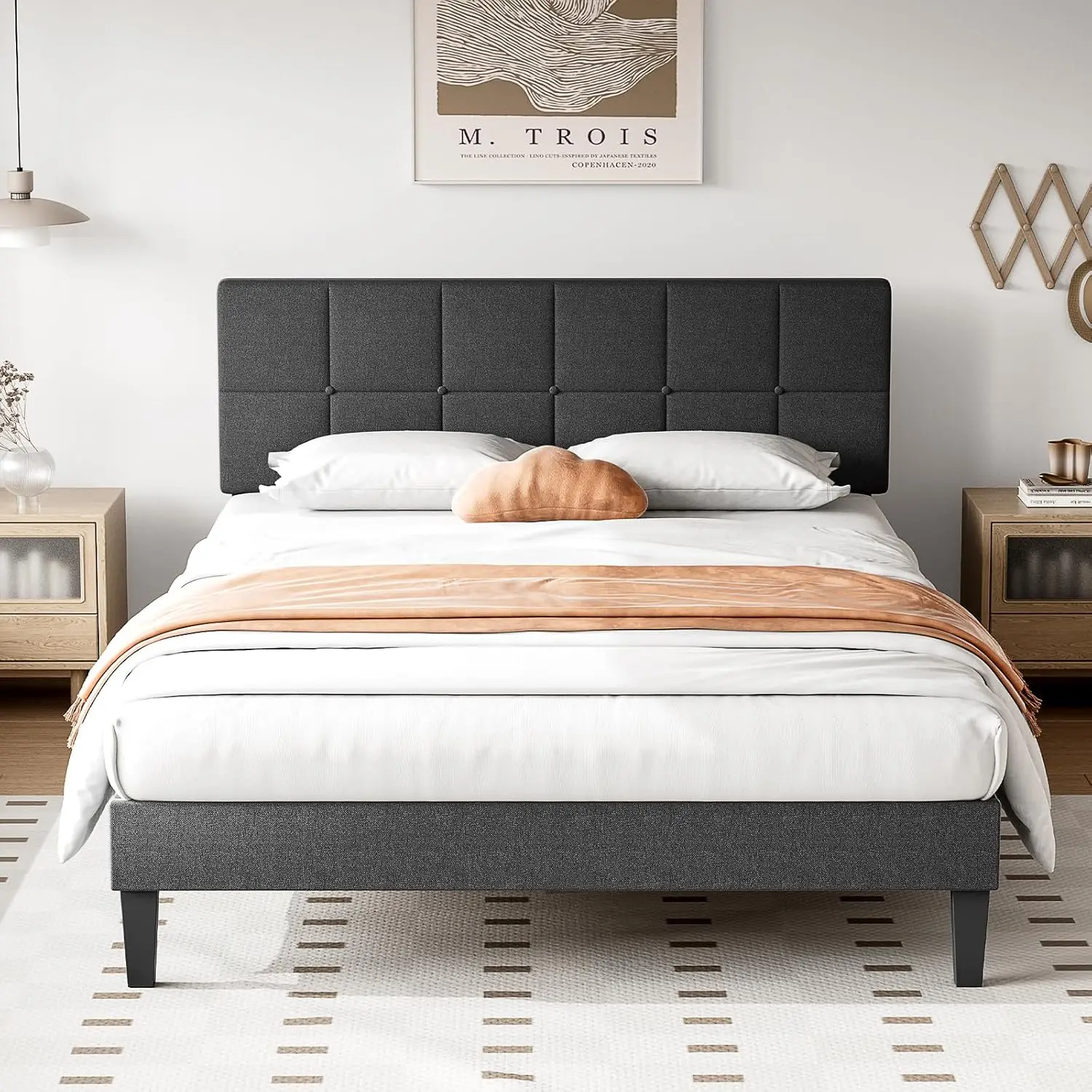 Marco de cama de madera tamaño Queen, plataforma tapizada de lino con cabecero, sin caja, con listones de madera resistentes de 800Lbs