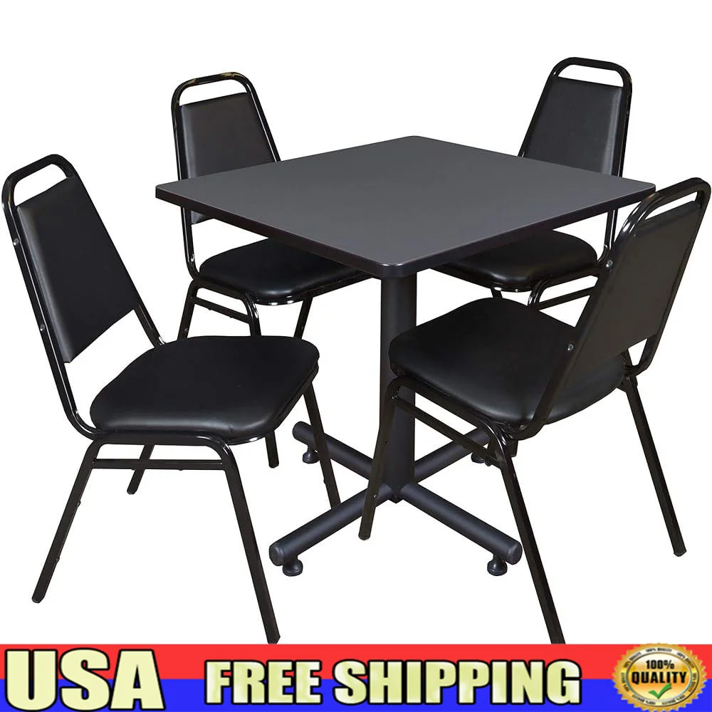 Mesa cuadrada para desayuno con 4 sillas apilables, sillas de vinilo negro, base en X de metal liso, melamina fundida térmica, restaurantes de 30 pulgadas