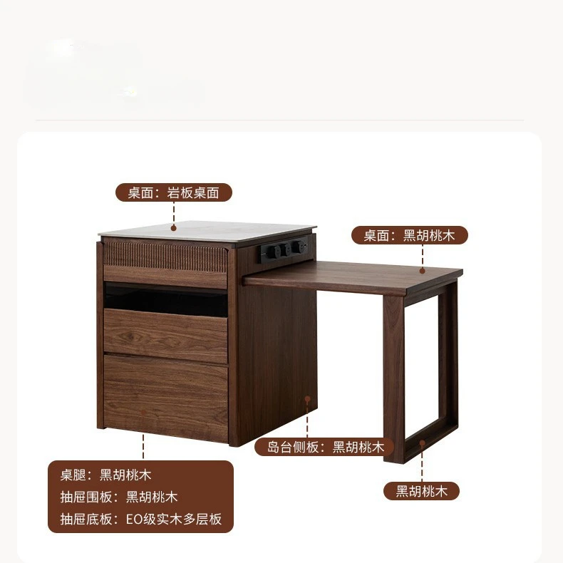 Mesa de comedor con isla de nogal negro de América del Norte, mueble de bar de losa de roca de madera maciza integrada, mesa de comedor telescópica simple nórdica