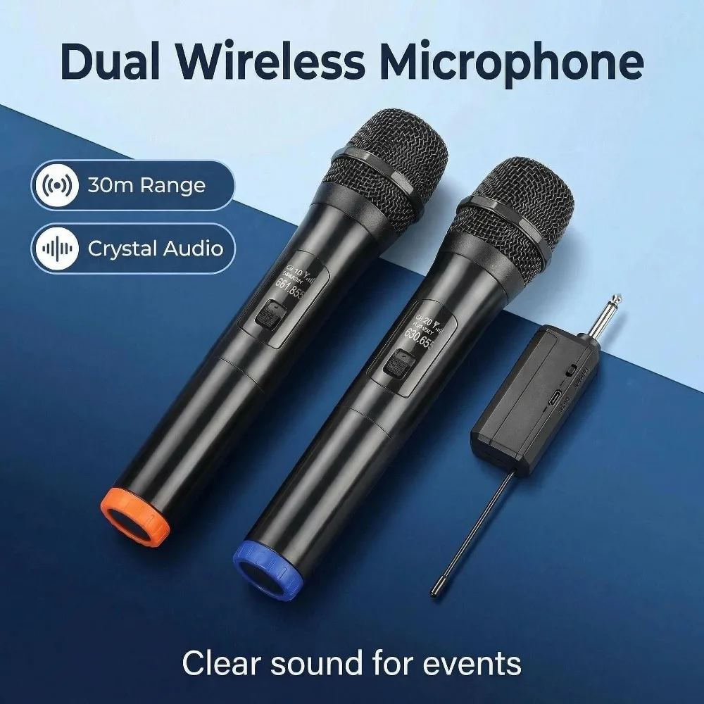 Micrófono inalámbrico UHF de frecuencia fija, 2 canales, micrófono de mano para fiestas, Karaoke, espectáculos profesionales en la iglesia, reuniones