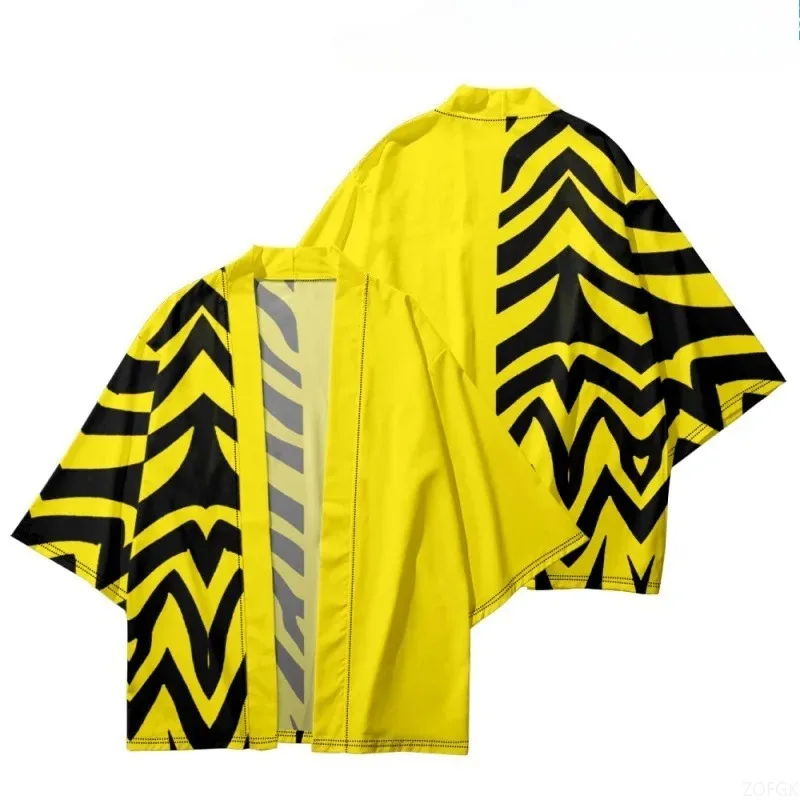 Moda de verano, Kimono holgado amarillo con estampado de rayas negras y flores, ropa de calle, cárdigan, bata para mujeres y hombres, Top Haori japonés Yukata