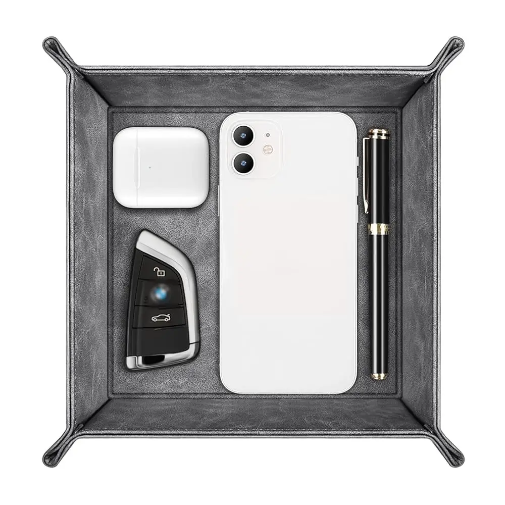 Organizador de almacenamiento de escritorio con bandeja de valet, contenedor de cuero Pu de primera calidad, bandeja de tocador para mesita de noche, soporte Caddy para control remoto