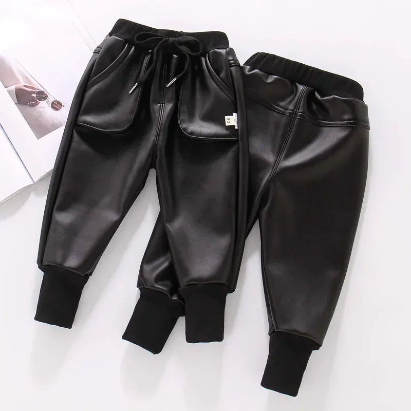Pantalones de piel sintética para niños, pantalones de invierno de lana de imitación negros para niños, pantalones cálidos de cuero para niños, pantalones de cuero para niños y adolescentes