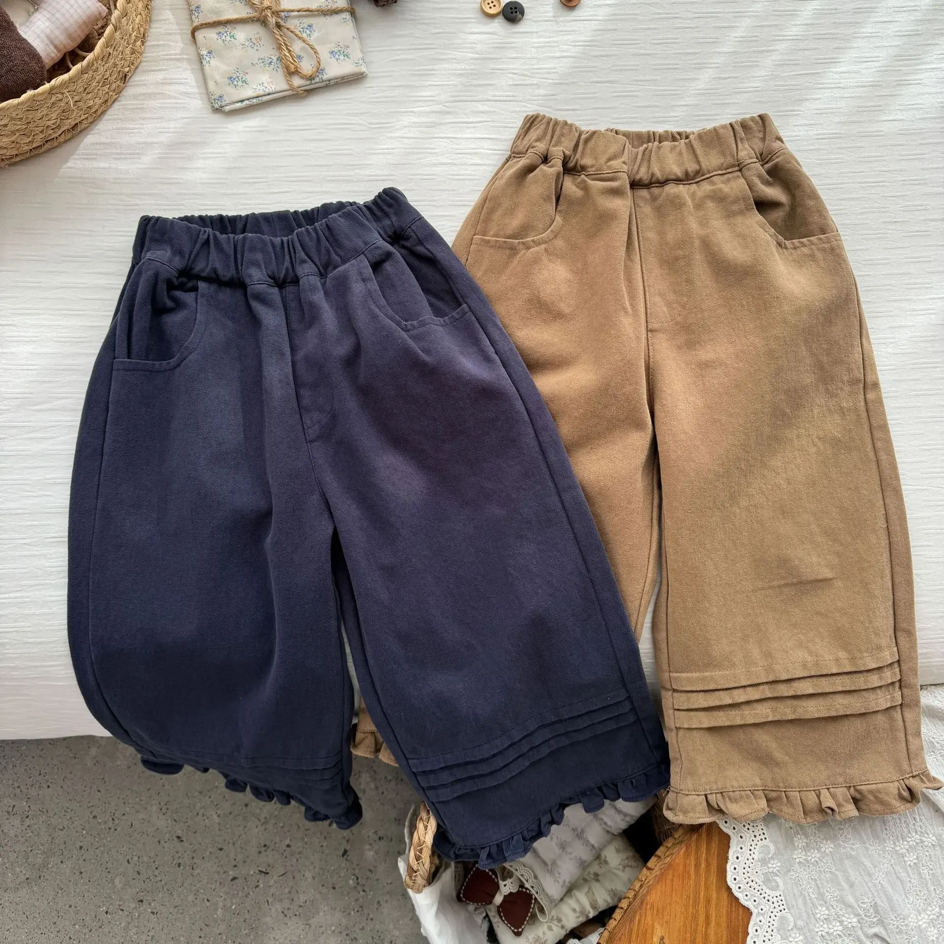 Pantalones de pierna ancha para niñas, primavera 2025, nuevo estilo Rural coreano, moda que combina con todo, pantalones de pierna recta de encaje, ropa para niñas