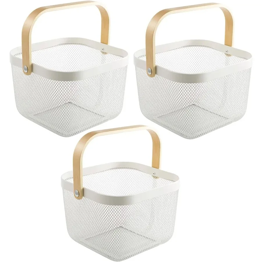 Paquete de 3 cestas de malla metálica de acero, cesta organizadora de almacenamiento, cestas de cocina colgantes multifunción, cesta de frutas con mango de madera