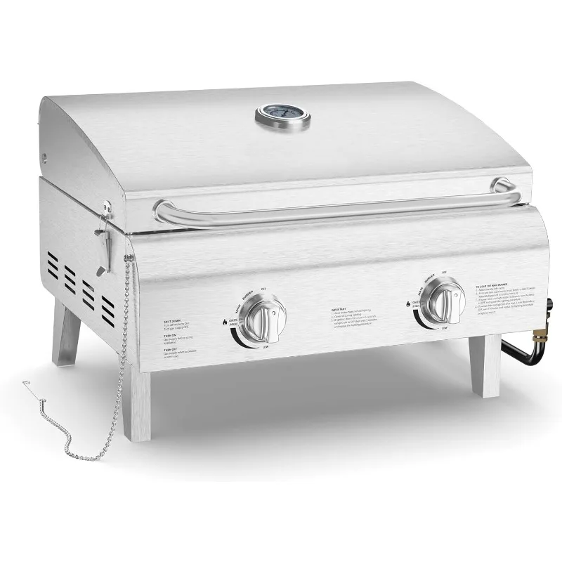 Parrilla de gas portátil de acero inoxidable – Parrilla de gas propano para barbacoa de sobremesa de fácil limpieza con 2 quemadores con patas plegables y resistente al viento