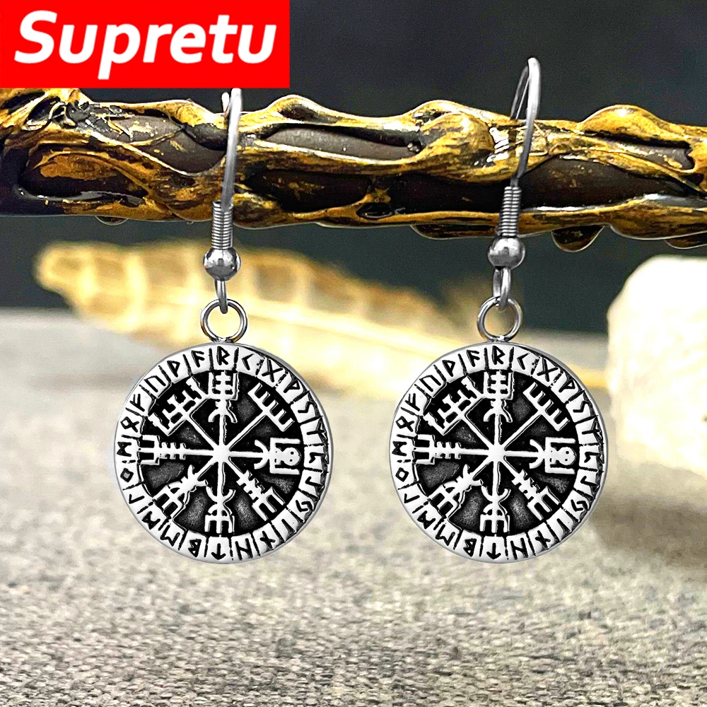 Pendientes de brújula vikingos Vintage para hombre, colgante de 24 runas, Vegvisir, talismán pagano, pendientes de gota de acero de titanio, regalos de joyería
