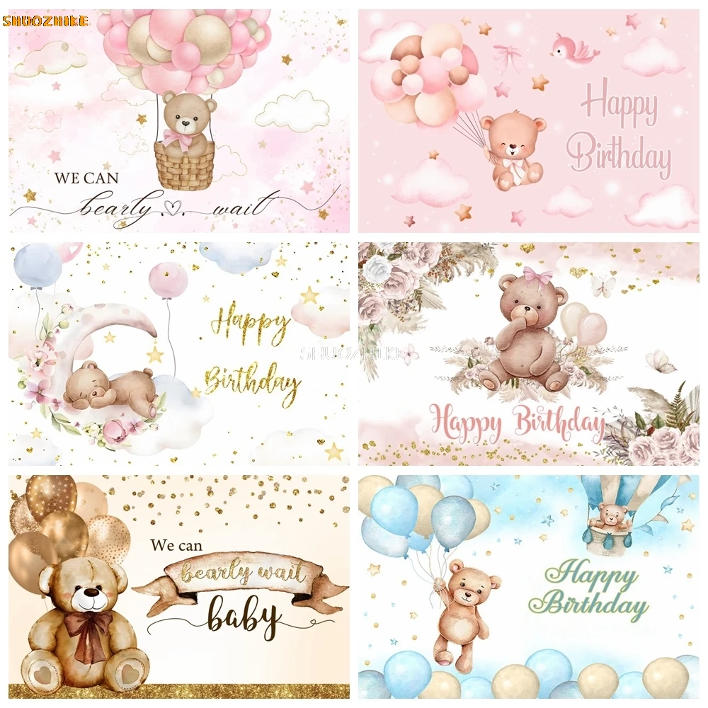 Pink Blue Teddy Bear Baby Shower Backdrop Newborn Boy Welcome Party Decor Background Boho Flower We Can Bearly Wait Backdrop