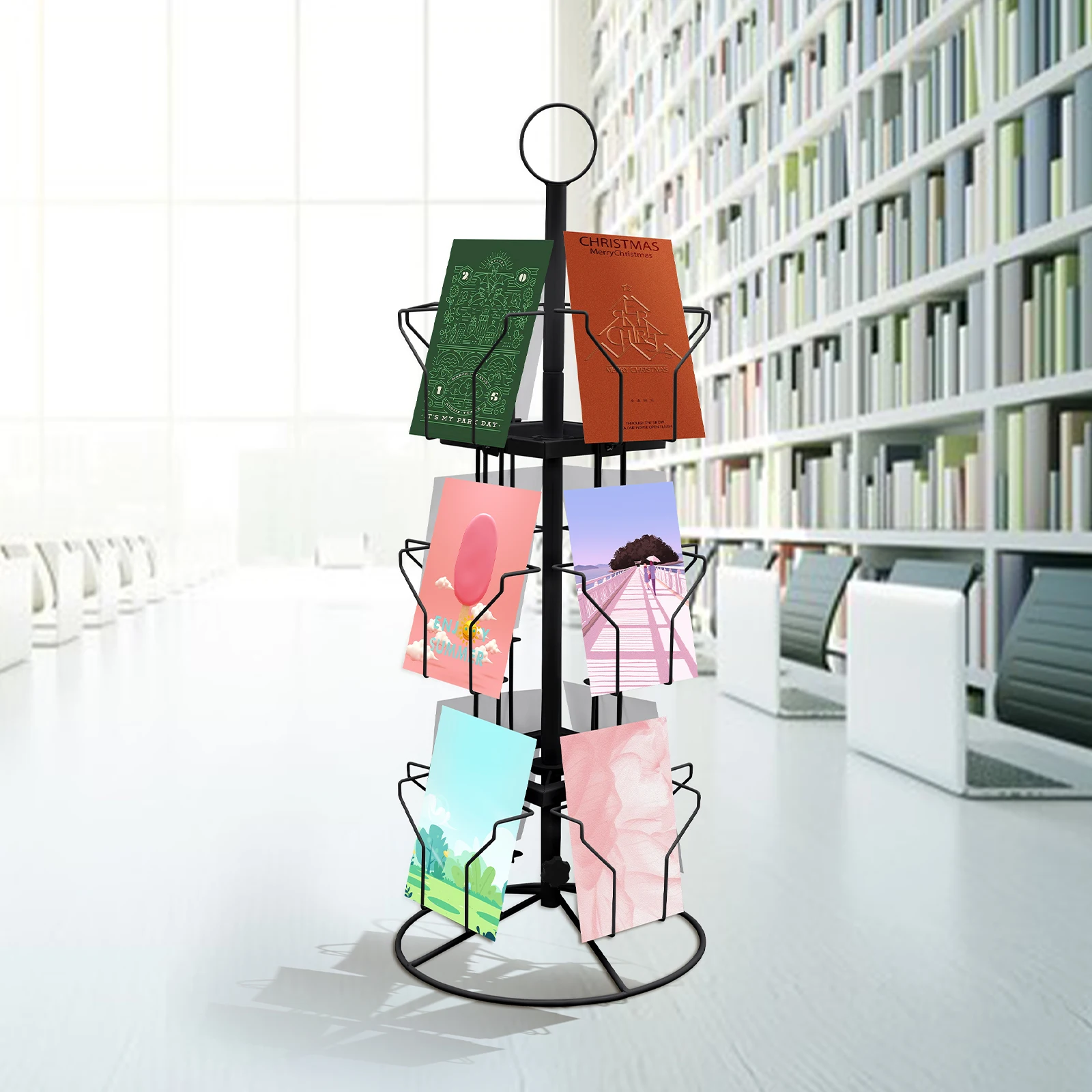 Portatarjetas de felicitación giratorio de tres capas de acero laminado en frío negro, soporte de exhibición de 12 bits, soporte de exhibición de tarjetas giratorio de 360 grados