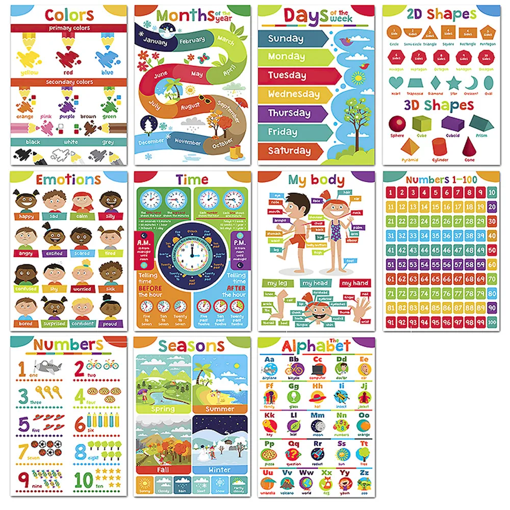 Pósteres Montessori de 11 piezas (16″x24″ laminado) – Días/2D y formas 3D/Emociones/Hora/Temporadas/Número 1-10/Cuerpos/Mesas/Años/Alfabio