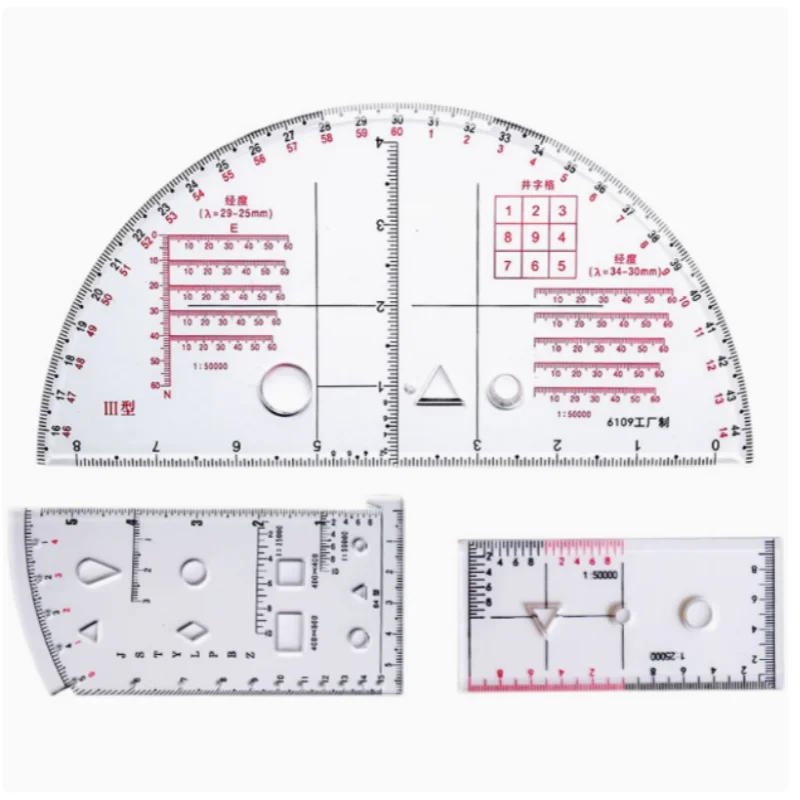 Regla de comando, regla semicircular de longitud y latitud, regla de operación topográfica, regla de coordenadas geográficas 1:50.000