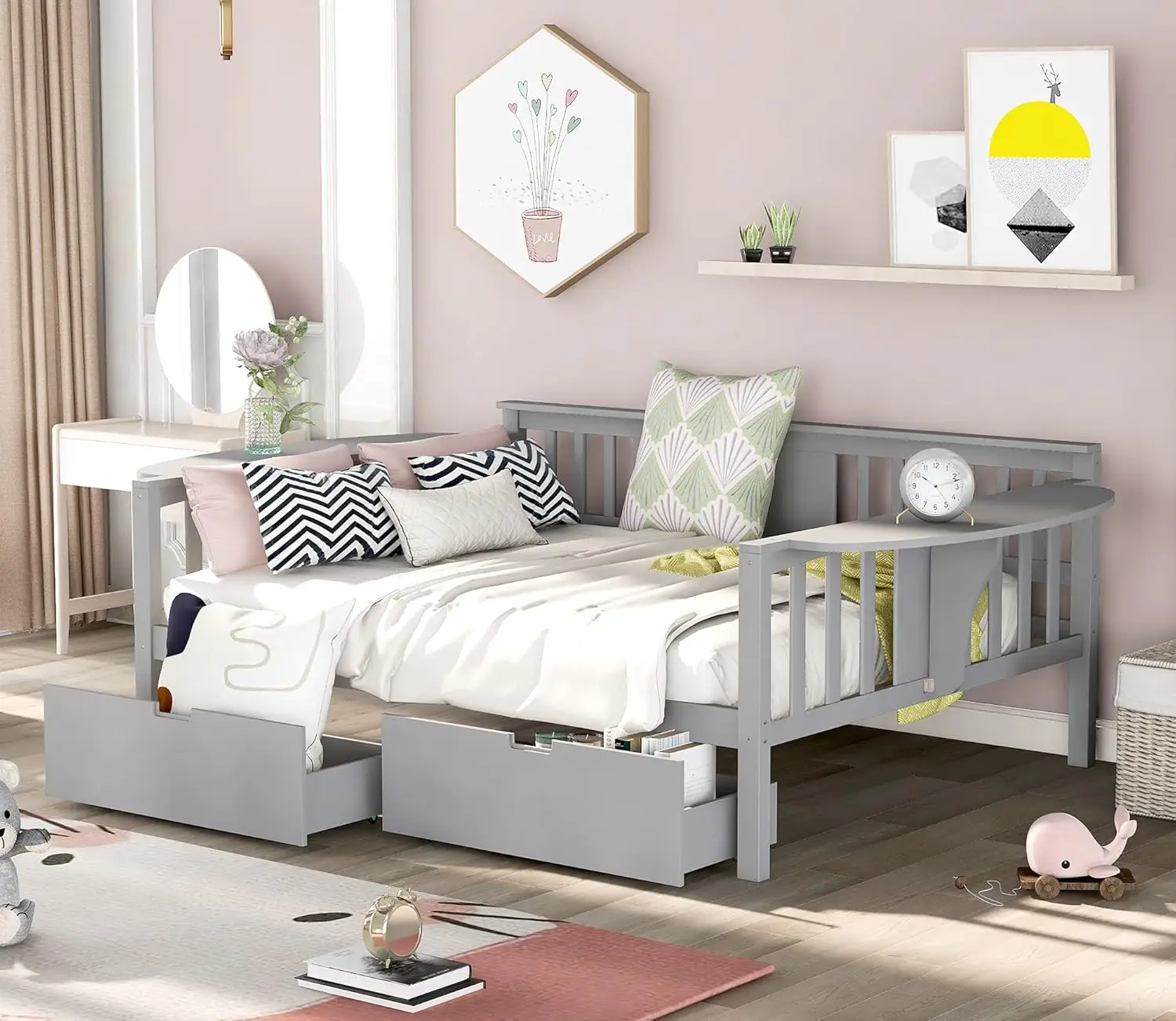 Sofá cama doble con cajones, sofá cama para sala de estar, estructura de sofá doble con mesa pequeña doblada para adultos. (Gris)