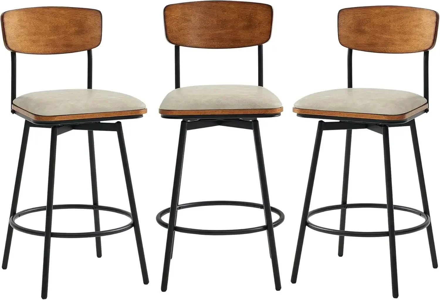 Taburetes de bar giratorios con altura de mostrador y respaldo, taburetes de bar tapizados de piel sintética, juego de 3, altura de asiento de 27″, gris arena