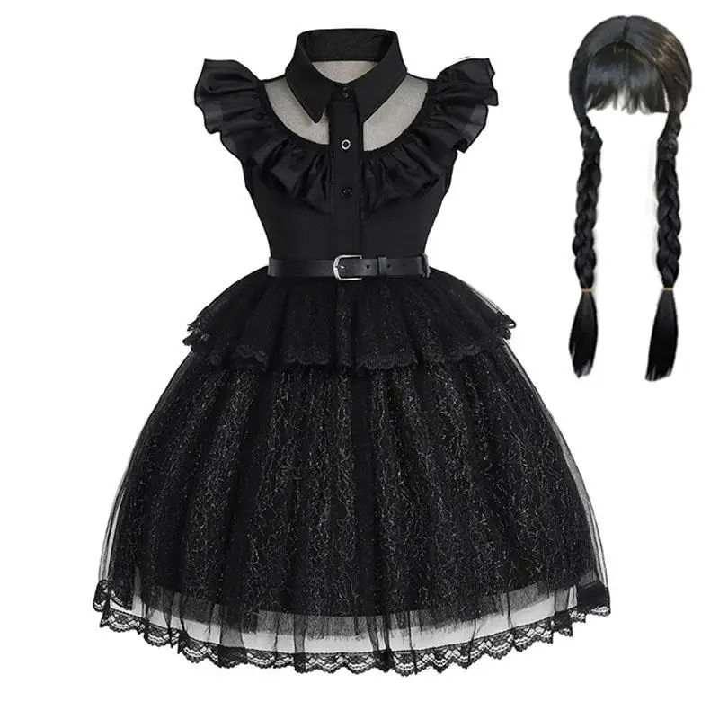 Vestido negro de Halloween para niña, nuevo miércoles Adams, mangas voladoras, cuello, cinturón de malla, empalme, vestido de princesa Cosplay de moda